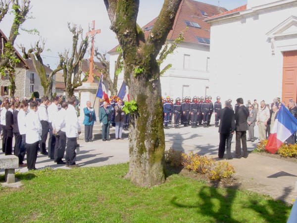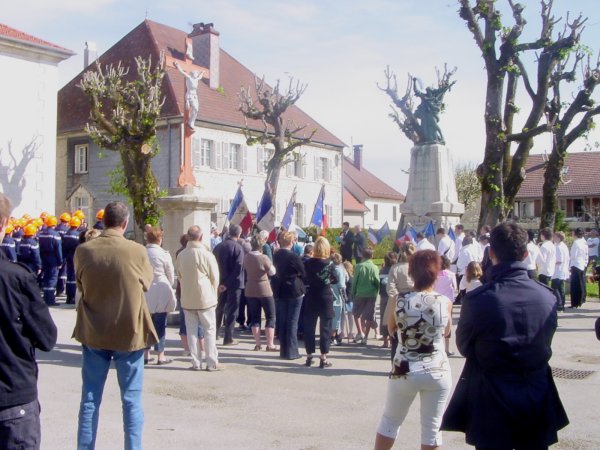 C'est par une matinée très ensoleillée que le 64e anniversaire de la victoire du 8 mai a été célébré à Frasne. Anciens combattants, sapeurs-pompiers, officiels et musique étaient entourés par la population du village. Après l'appel des morts et le discours du maire, un cortège s'est formé, puis s'est rendu au Carré militaire du cimetière pour honorer les soldats morts au combat. Ce cortège s'est ensuite rendu au centre d'animation où un hommage fut rendu par le C.M.E.J. à Anne Frank, jeune juive déportée au camp de Bergen-Belsen et morte en mars 1945. |